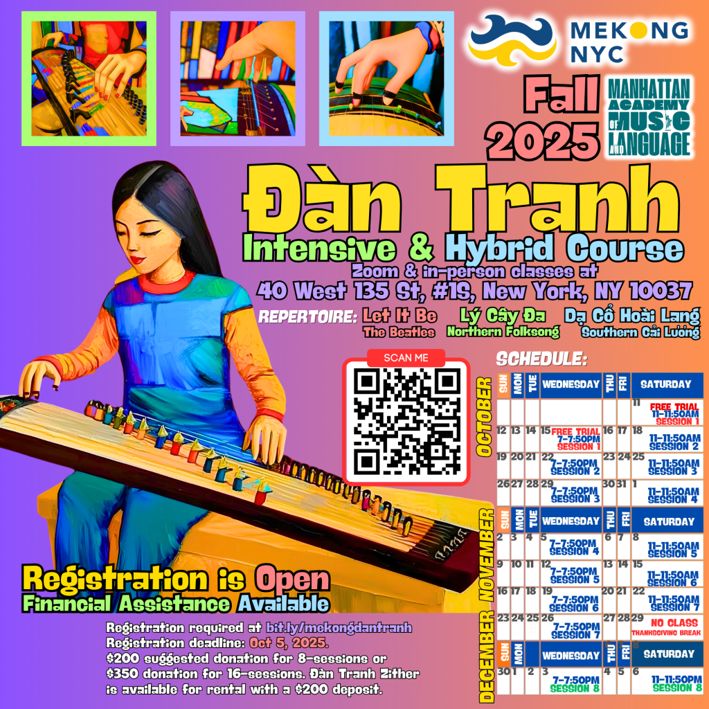 Mekong NYC hosts a music class to teach students how to play the đàn tranh (Vietnamese zither). The class is infused with storytelling, especially Vietnamese folk tales and culture, community building through group playing and listening, and group theory, examining traditional Vietnamese and Cambodian songs and pop music.