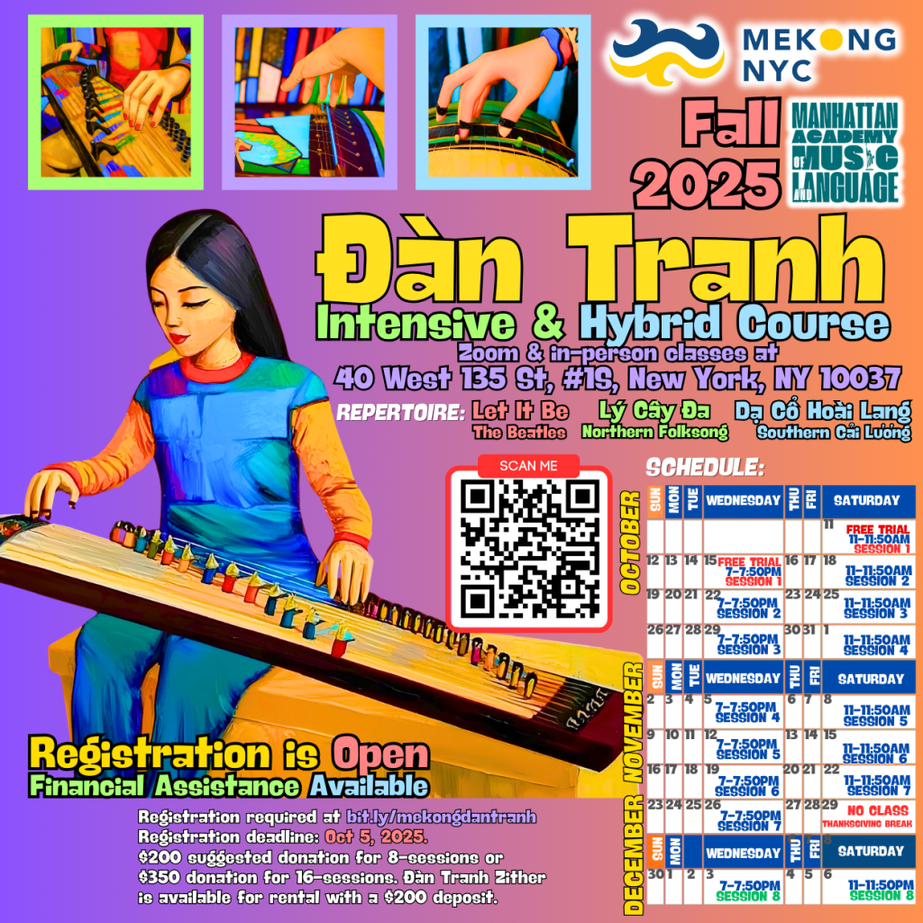 Mekong NYC hosts a music class to teach students how to play the đàn tranh (Vietnamese zither). The class is infused with storytelling, especially Vietnamese folk tales and culture, community building through group playing and listening, and group theory, examining traditional Vietnamese and Cambodian songs and pop music.