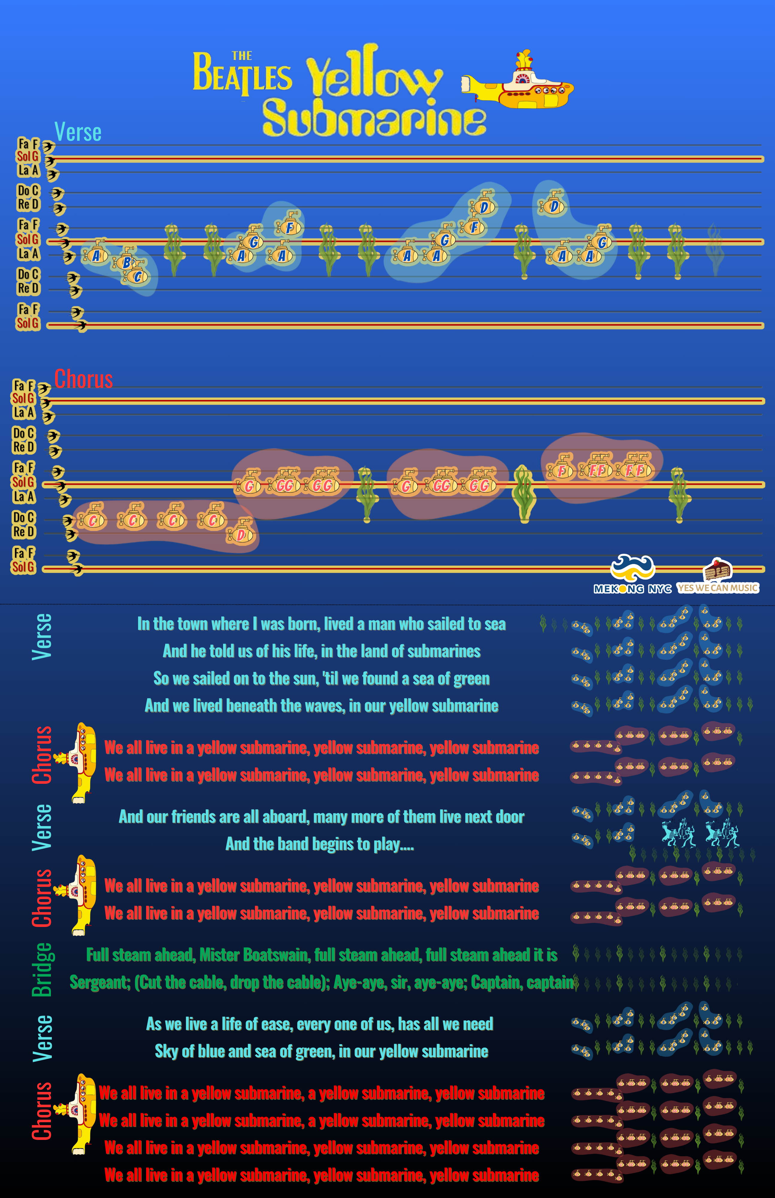“Bản hòa nhạc “Yellow Submarine” của nhóm The Beatles được sáng tác vào giữa những năm 1960 trong giai đoạn sáng tạo và thử nghiệm của họ. Đó là một bài hát ngây thơ, đáng yêu chủ yếu do Paul McCartney viết và liên quan đến phong trào phản truyền thống của thời đó. Nó trở thành bản nhạc nền cho bộ phim hoạt hình phát hành vào năm 1968, làm tăng thêm sự hấp dẫn lâu dài và liên kết với thời đại siêu thực.”